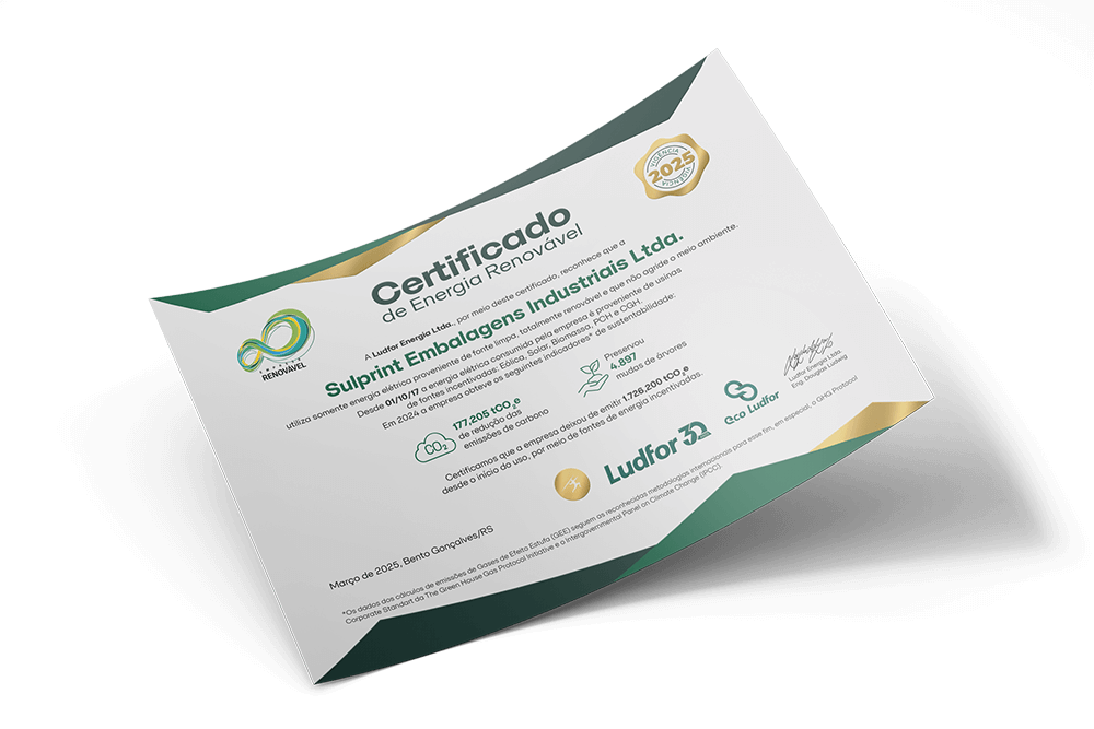 A Sulprint assumiu o compromisso de empresa que, na realização de suas atividades e no consumo de energia em seu parque fabril, somente usa energia proveniente de fonte limpa, totalmente renovável e que não agride o meio ambiente.